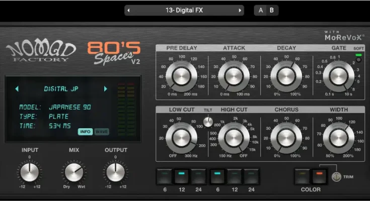 Developed by Nomad Factory in collaboration with Plugivery and MoReVox, This plug-in is designed to emulate the typical reverbs and space effects used by legendary artists and producers of that era, such as Michael Jackson, Madonna, Duran Duran, David Bowie, U2, Queen and many others.