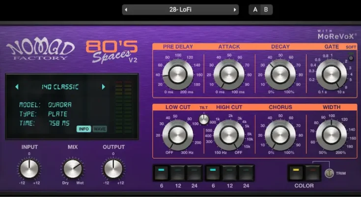 Developed by Nomad Factory in collaboration with Plugivery and MoReVox, This plug-in is designed to emulate the typical reverbs and space effects used by legendary artists and producers of that era, such as Michael Jackson, Madonna, Duran Duran, David Bowie, U2, Queen and many others.