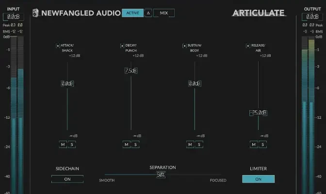 Take control of your mix with Articulate, the next generation envelope shaper that makes fixing dynamics as simple as using an EQ. More than a transient shaper, Articulate separates your audio into four bands: Attack, Decay, Sustain, and Release. By dialing in the desired level on the corresponding fader, you can instantly add Smack, Punch, Body, and Air to any source.