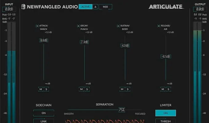 Take control of your mix with Articulate, the next generation envelope shaper that makes fixing dynamics as simple as using an EQ. More than a transient shaper, Articulate separates your audio into four bands: Attack, Decay, Sustain, and Release. By dialing in the desired level on the corresponding fader, you can instantly add Smack, Punch, Body, and Air to any source.