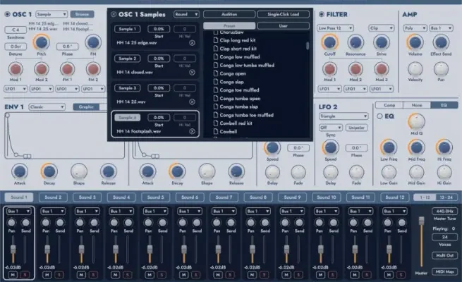 The new user interface adapts effortlessly to any screen size, while enhanced MIDI Learn lets you define minimum and maximum parameter ranges for expressive performance. Dedicated browsers for kits, sounds, samples, and MIDI mappings keep inspiration flowing without interruption.