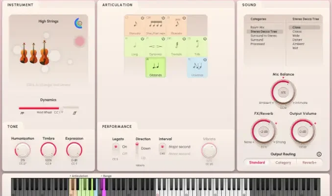 The High Strings patches capture the soaring elegance of Vienna’s finest string players. With 14 first violins, 12 second violins, and 8 violas performing together – the violas an octave below the violins – this ensemble offers a broad and balanced tone that is ideal for lyrical melodies, sweeping themes, and radiant textures.