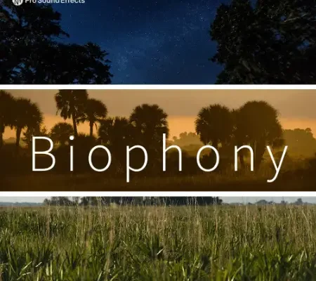Featuring 38 pristine nature recordings from remote locations across the U.S., Biophony delivers a diverse collection of ambient environmental sounds. Delivered in 24-bit/96kHz Ambisonic B-format (FuMa) format as well as stereo, this library contains amphibians, sea animals, insects and other wildlife interacting within distinct biomes. Use these sounds to enliven your nature scenes with a rich, authentic ecological backdrop.