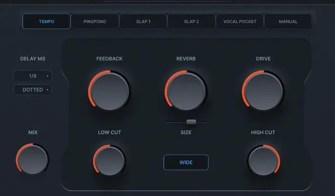 • Drive that pushes the delayed signal with analog-style saturation. Adds warmth, grit, and character. Perfect for vocals, guitars, or anything that needs a bit of edge.