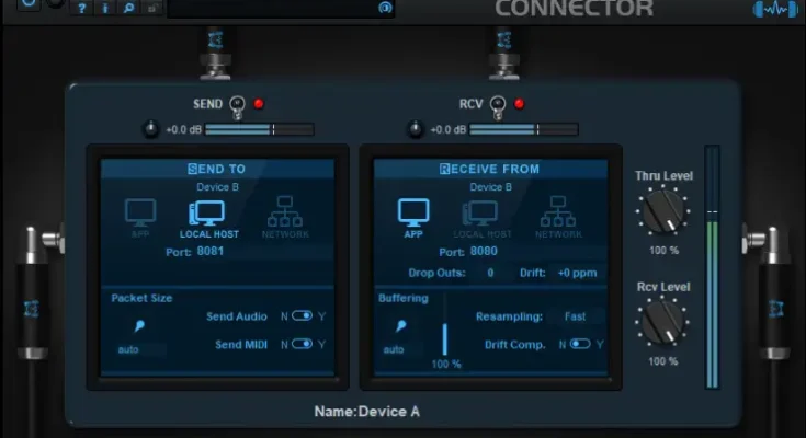 Blue Cat’s Connector is an audio & MIDI streaming plug-in that can be used to transmit audio and MIDI signals in real time between several computers or applications, or create your own routings within a single application, with minimal latency.