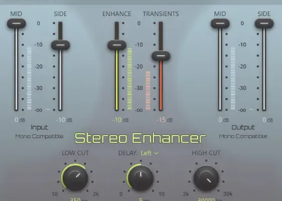 Independent mid/side control – the ENHANCE slider exclusively boosts the side channel, preserving the integrity of the mono signal. To further enhance width, the OUTPUT MID slider adjusts mid content independently, ensuring full control of the original mono component.