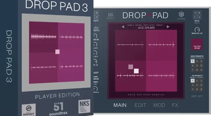 Drop Pad 3 is a significant update to the established Drop Pad series: Now being an official Kontakt Player instrument with full hardware support of NKS compatible keyboards and controllers – loading, creating and shaping sounds in Drop Pad is even more convenient.