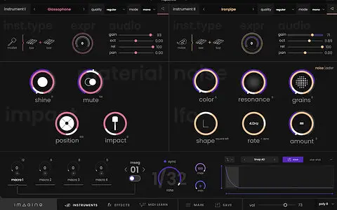 Imagine offers hundreds of modeled instrument layers with very diverse and bold sound identities. All 400 included presets combine two of these instrument layers to offer unheard acoustic timbres.