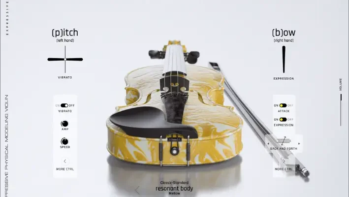 Physically modeled solo strings, VLN 356, the violin, VLA 419, the viola, CLO 759 the cello and DBS 1130, the double bass, designed for MPE and MIDI controllers, offering intuitive real-time control over articulation, bowing, vibrato, and dynamics.