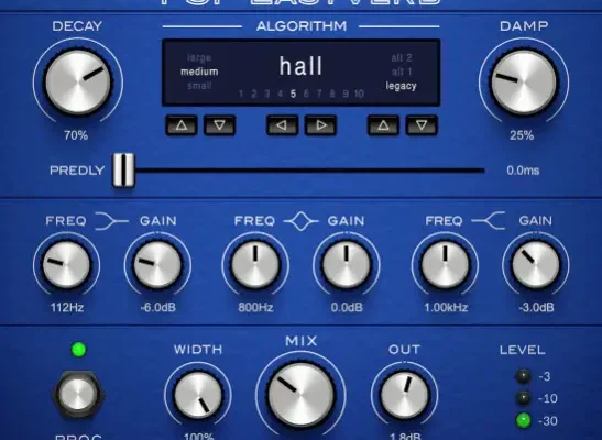 PSP EasyVerb gives you a choice of ten beautiful algorithms: Ambience, Room, Chamber, Club, Hall, Arena, Cathedral, Spring, Plate and Reverse. Each algorithm interacts differently with the same set of simple controls, so you don’t have to re-learn the plug-in every time you change your sound.