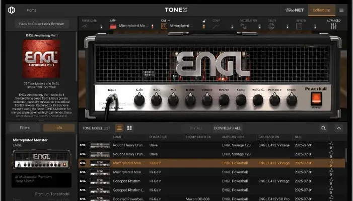ENGL Ampthology Vol 1 features 6 legendary ENGL amplifiers, each with exclusive TONEX Tone Models, including amp‑only captures for ultimate flexibility. From crystal-clear cleans to crushing high-gain tones, every amp is expertly modeled to deliver its authentic ENGL character in a mix-ready, studio-quality format.