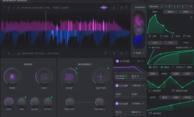 Grainferno can generate grains from two independent source files and morph between them in real time. With seven unique modes to morph between signals, you can create granular soundscapes that continuously shift between the character of each sample.