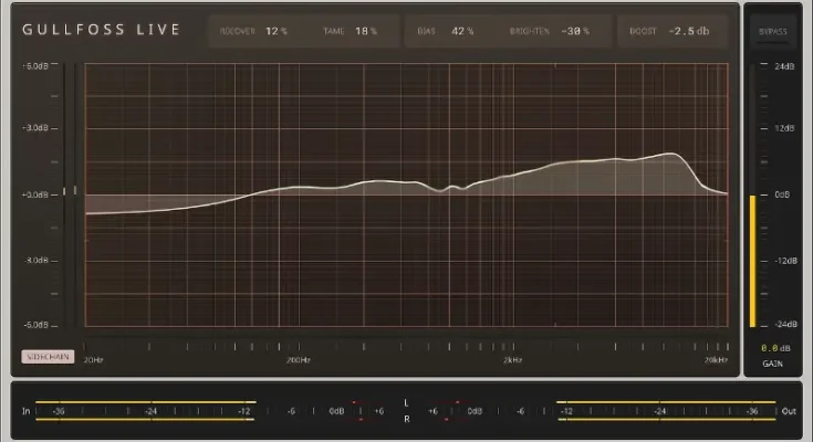 Gullfoss is even capable of fixing balancing issues between different sound elements without access to the individual tracks. The internal auditory model allows Gullfoss to make objective decisions about the perceived sound. As a result, mixes processed with Gullfoss will generally translate more consistently between different listening situations.