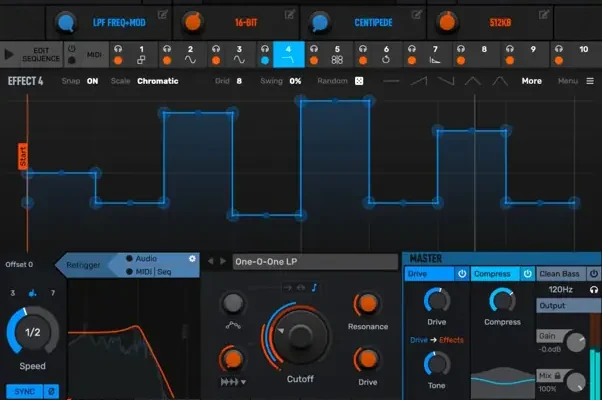 Each effect has two tempo-sync’ed, multi-segment envelopes for modulating key parameters. Generate random patterns, euclidean rhythms, apply swing, and pitch snapping.
