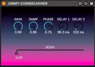 COMBSCANNER is an Ableton Max4Live device created by JIMMY, using a new technique termed “SCAN Synthesis”. The technique was discovered during research into simulating harmonic resonance feedback, primarily using crossfading multiplexers, sine tones & clip distortion.