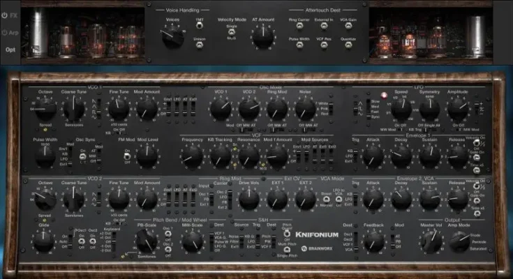 The Knifonium is an exceptionally beautiful-sounding analog synthesizer that is driven by a whopping 26 vacuum tubes. This upscale synth features two tube-driven oscillators, a 4th order ladder filter, a ring modulator, and a gorgeous “steampunk” aesthetic.