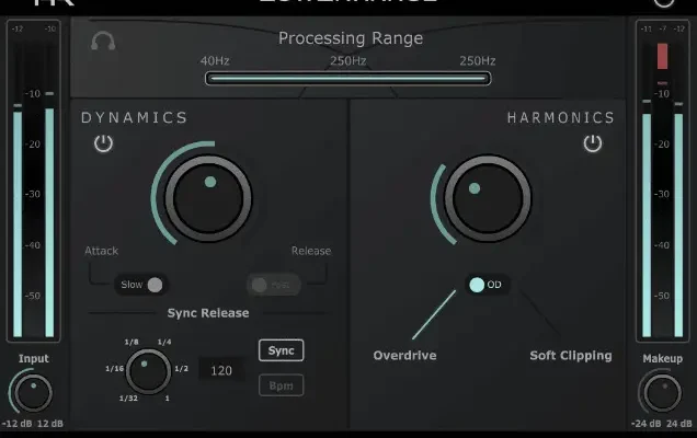 Use the built-in filter to select the specific frequency range you want to process (40Hz to 250Hz). Preserve clarity and definition in your mix by precisely tailoring your bass frequencies.
