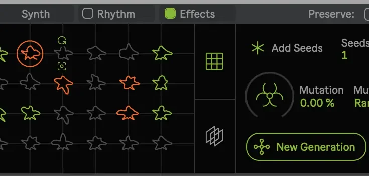 For this device, the genetic preset system applies to presets of an internal poly synth + note generator + effects system