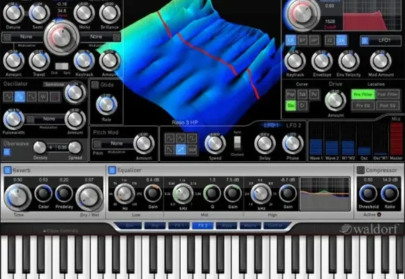 Anyone at all familiar with Waldorf software instruments will immediately feel right at home with the typical Waldorf workflow where sound shaping modules are always directly accessible and all Arpeggiator, Envelopes, Effects, and Modulation Matrix management controls are only one push of a virtual button away.