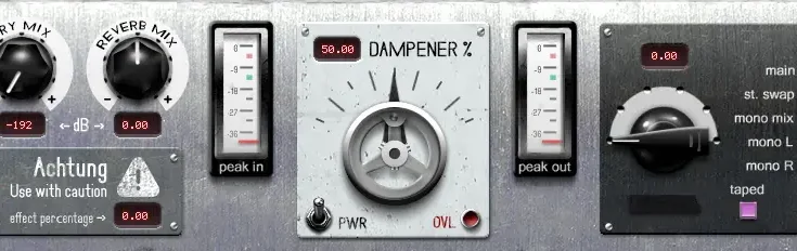 The first plate used solid state amplification and provides a big wide stereo reverberation (I’m naming it Olympus). The second was one of the earlier plates that used a tube amp and one pickup for a mono output (I named it Styx because of how murky it is). These two variations of this plate are known to provide very different results. Both were sampled to include a fully functional dampening control. It sounds and works great. You won’t find too many other Nebula reverbs with sampled adjustable controls in them, besides some of the other ones I’ve done.