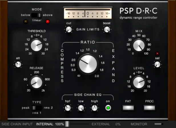 PSP DRC also introduces a complementary compressor-expander pair function, which can be achieved by setting the Ratio to 2:1 in the compressor and down to 1:2 in the expander. The inclusion of advanced side chain features and external side chain support further elevates PSP DRC’s capabilities, transforming it into a comprehensive compander system.