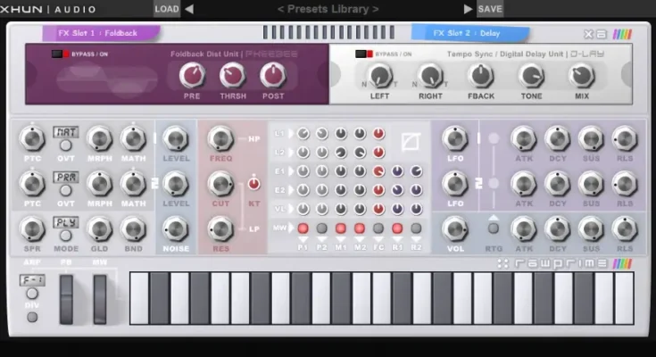 RawPrime is a physically modeled hybrid synthesizer, built using specific digital and analogue electronic components derived from the 1970s-1980s telecommunications industry.Meant to be a real-world replicable device and manufactured using vintage electronics, RawPrime features a very original synthesis approach : at first it generates huge amounts of aliasing signals on purpose, then it uses that aliasing signals as its sole sound source.An expressive analogue filter, a set of modulators accessible from a matrix interface, two multi-effect slots and a creative polyphonic arpeggiator just complete the picture : RawPrime aims to be one of the all-time favourite vintage synthesizers, from a past that never was.
