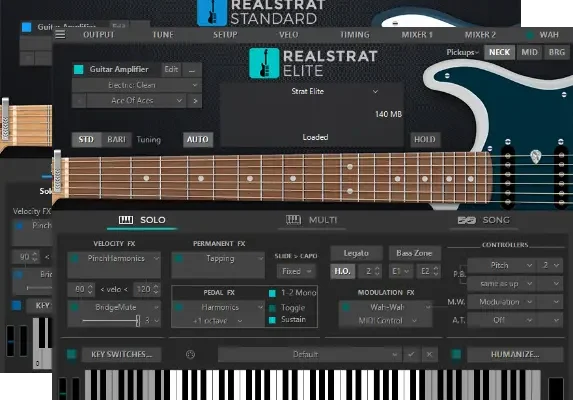 RealStrat sample-based virtual instrument faithfully reproduces the Stratocaster(R) sound from both the sonic and playability perspectives. Our advanced technology gives its users the freedom to create everything from simple strumming techniques to the most sophisticated solos.