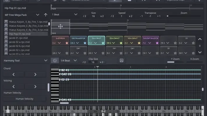 Editor Tools: The Editor Tools, located on the left side of the Editor, offer a suite of features for refining your MIDI sequences. These tools allow you to efficiently harmonize, generate melodies, apply strumming effects, humanize, quantize, reverse, time-stretch, and more.