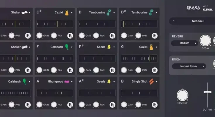 Skaka is a sample-based sequencer plugin for shaker percussion instruments. It has 12 slots, each with its own instrument, parameters (lots of them!) and pattern. We’ve built both the sequencer and the sampler from the ground, to optimize this instrument for these types of sounds. Each pattern contains events, with individual parameters like pitch, velocity (as in how fast the instrument is shaken), and envelope.