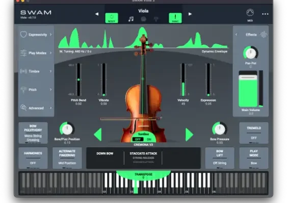 SWAM Solo Strings is a collection of products that includes SWAM Violin, SWAM Viola, SWAM Cello, and SWAM Double Bass. Developed using the Digital Waveguide Synthesis (Prof. Julius Smith – Stanford University) combined with the Synchronous Waves Acoustic Modeling technology.