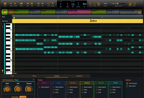 AI algorithms convert audio into pitch and midi notes. The Pitches Viewer allows you to selectively view the spectrograms and notes of all tracks in the song. It is a useful tool to assist you in transcribing music and for viewing how the various parts combine to make the song.