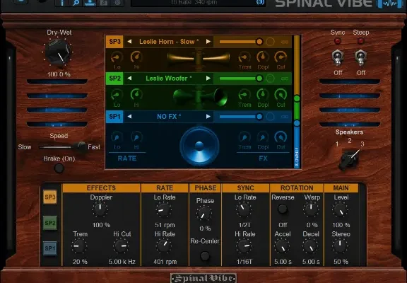 Spinal Vibe offers up to 3 rotative speakers, with full control over the rotational behavior of each speaker: you can not only select their rotation speed and curve, but also the amount of Doppler, amplitude modulation and dampening independently, as well as their acceleration and deceleration characteristics.