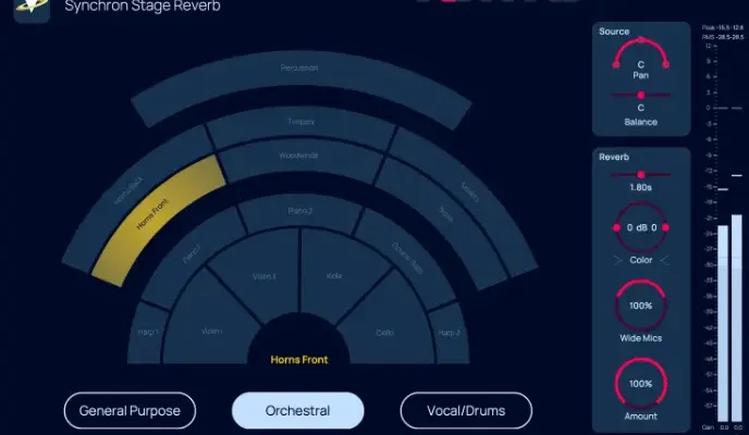 Synchron Stage Reverb is designed to deliver stunning spatial realism for all your stereo and surround production needs. Whether you’re working in simple stereo or crafting cinematic 7.1 mixes, this reverb plug-in adapts seamlessly to your workflow and genre. With multiple impulse responses captured at several mic positions – including the classic Decca Tree, surround outriggers, and height channels – you can intuitively place your audio signals at pre-defined positions of three main options: general purpose, orchestral, and vocal/drums for band settings.