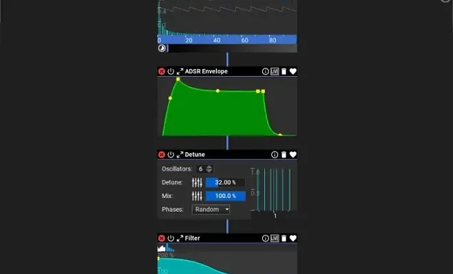 We made the UI as simple as possible. Instead of having hundreds of knobs and junctions for a usual modular synth, using Syne is simple and straightforward. Zooming in is smooth and will show more details. Font size and all colors of the UI are adjustable.