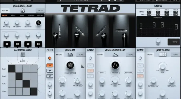 Tetrad is like no other synth you’ve ever used. Developed in collaboration with composer and transmedia artist Gadi Sassoon, the plugin takes four oscillators, routes them in combination through a Quad AM processor that works like a pseudo-sequencer, a specifically tailored Granulator, and four physically modelled plate resonators.