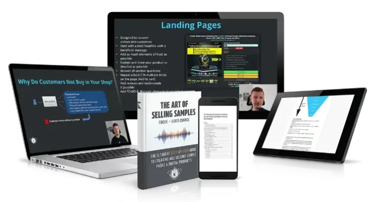 What You Will Really Getthe image shows different devices showcasing the video course and e-bookA comprehensive ebook as a PDF file with 86 pages, 25,000+ words, that includes the full step-by-step instructionsAn over 2 hour long English video course with English subtitles containing 10 video modules“How to create professional digital products” PDF and video guide that explains how to create every type of digital audio productBonus: License agreement – template for your own productsBonus: Access to the secret Facebook group exclusively for course members