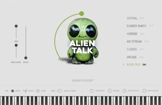 Component name: ALIEN TALK. Real-time parameters: Number of Aliens, Anger, Gain and Speech speed (main knob). Automatable parameters: # of Aliens, Anger, Gain and Speech speed.