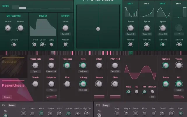 The spectral engine lets you manipulate your sound in the frequency domain, unlocking a variety of unique effects. By isolating specific frequencies, you can freeze your sound in place. Delaying different frequency bands individually produces stunning, evolving results.