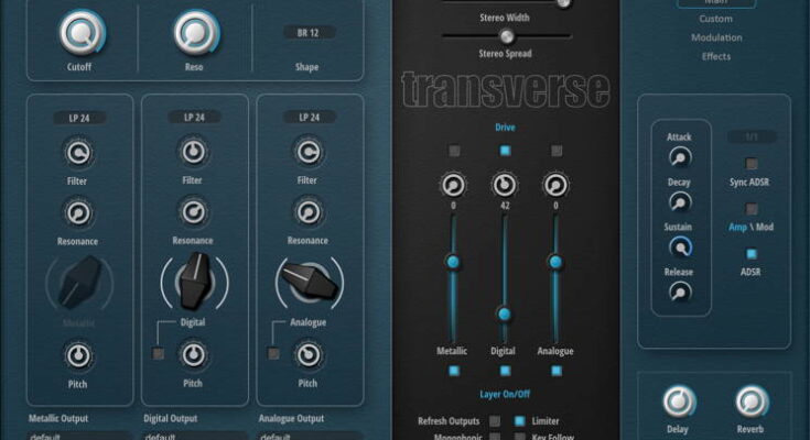 Transverse is a creative instrument for designing expressive sweeps, transitions, reverse sounds, risers, and rhythmic riffs for movie scores, games, and music. You can layer sounds using three sources — metallic, digital, and analog — and, thanks to its in-depth modulation options, new noise profiles, powerful granular engine, and expressive samples, you can create evolving textures to fit your sound perfectly.