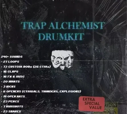 240+ SOUNDS – 27 LOOPS – 73 CUSTOM 808s (26 CTMs) – 16 CLAPS – 16 FX & MISC – 20 HIHATS – 3 KICKS – 6 OPENERS (CYMBALS, THUNDERS, EXPLOSIONS) – 14 OPEN HATS – 23 PERCS – 7 RIMSHOTS – 23 SNARES – 13 VOX