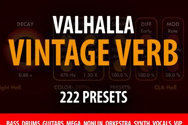 Elevate your Valhalla Vintage Verb experience with 222 professionally crafted presets!Well-arranged into categories, this collection is perfect for mixing, creating cinematic soundscapes, crafting an ’80s vibe, and more.20 Ambience 24 Bass (Ambience, Chorus, Room)33 Drums (Fills, Snare, Percussion)4 FX13 Guitar8 Mega (Vangelis Inspired)16 NonLin (Snare, Toms)13 Orkestra (Chamber and Big Hall)36 Synth9 VIP (Inspired by industry professionals)45 Vocals