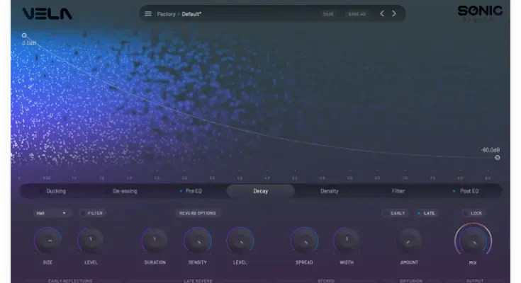 From ultra real spaces to impossibly massive soundscapes Vela is unmatched in versatility and sound. Vela gives you total control over every aspect of a reverb’s architecture with its fully customizable early reflection system combined with a node based late reflection engine enabling you to finely tune density, decay and damping filter over time for a luscious, smooth tail.