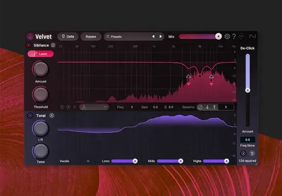 Soften sibilance and dynamically shape tone with intelligently split Sibilance and Tonal channels. Instantly identify sibilant frequencies with Sibilance Learn, and precisely remove distracting mouth sounds, pops, and clicks with De-Click.