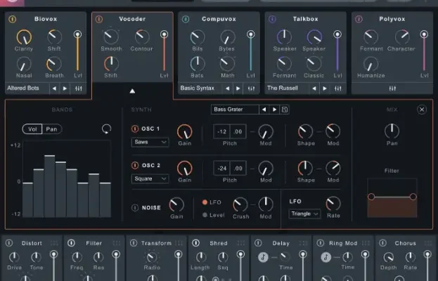 Stompbox-style effects: VocalSynth 2’s effects include two brand new pedal-style effects: Chorus and Ring Mod with a unique tremolo effect. Now drag to re-order all seven effects including an improved Shred with sequencer as well as Distort, Filter, Transform, and Delay.