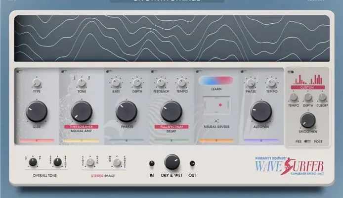 Wavesurfer is powered by the cutting-edge Karanyi Neural AI. Real-time audio analysis sculpts your signal to create the perfect balance of clarity, character and warmth in its effects. The AI-powered Neural Reverb is the best example of this. It adapts your signal to create reverbs with the perfect ambience and shape for your mix. Neural AI is also key in delivering the Wavesurfer’s stunningly accurate emulations of classic analog tape machines and guitar amplifiers. This Amp section was created by training AI on detailed models of classic and modern analog hardware.