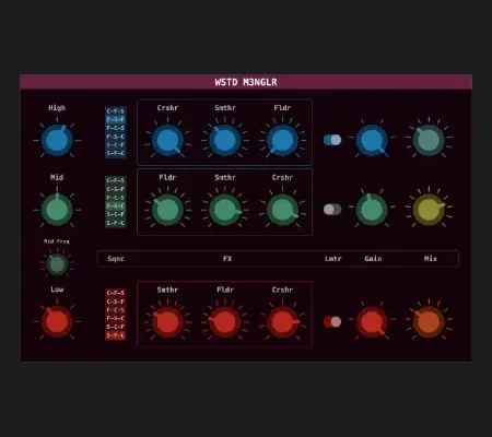 The sum is greater than the parts. This effect plugin is a combination of our 3Q and KANGLR plugins for some triple band distorting action. It consists of 3 different distorting effects. Namely the CRSHR, which does bit reduction. The FLDR, a wave folder. And the SMTHR, a soft-clipping overdrive. The order of these 3 wave-mangling stages can be set at will, creating some wildly different sound distorting effects.