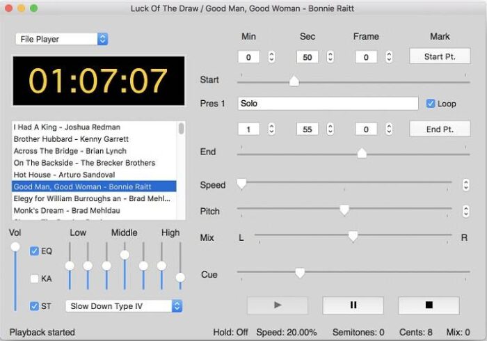 Change the speed of the music – from 20% (one fifth speed) to 200% (double speed) without changing the pitch.
