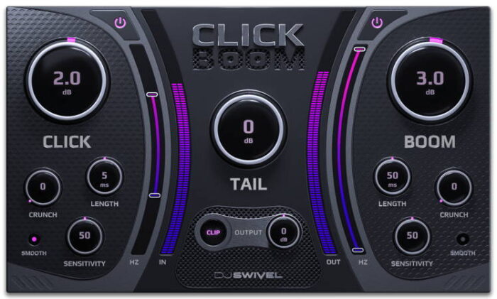Click Boom is an incredibly powerful transient shaper, giving you independent control over both the high “clicky” transients, and the low “boomy” transients in your sounds. Clever name huh? Click Boom was designed with producers in mind, with a simple and easy to use UI, and producer driven features to really help you shape the tone and dynamics of your drums, guitars, basses and final mixes!