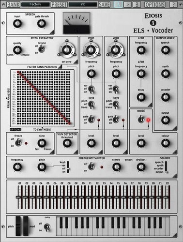 – Standard vocoder features : pitch tracker, voiced/unvoiced detector, two VCOs, two LFOs, noise generator, etc…