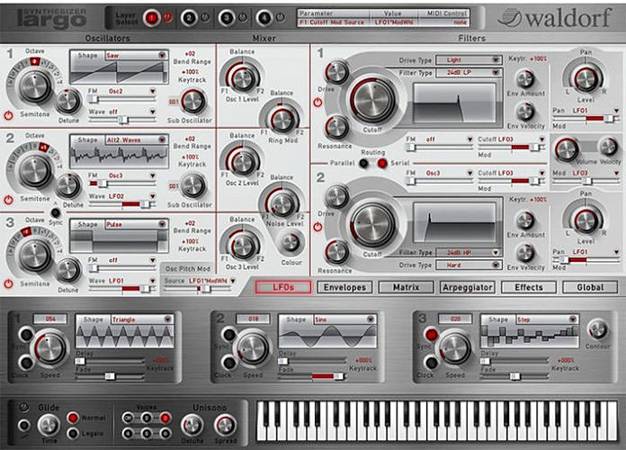 Largo offers three fat oscillators, two of them with sub oscillators. These oscillators include models of classic analog waveforms as well as a selection of waves from the PPG and Waldorf Wave stored in two Wavetables. All these run through two Waldorf multimode filters with steep cutoff, resonance up to self-oscillation and a drive stage to add even more punch and grainyness to the sound. Ultra-fast envelope generators and flexible LFOs as well as an easy to understand, yet extremely versatile modulation matrix make for a sound designer’s dream.
